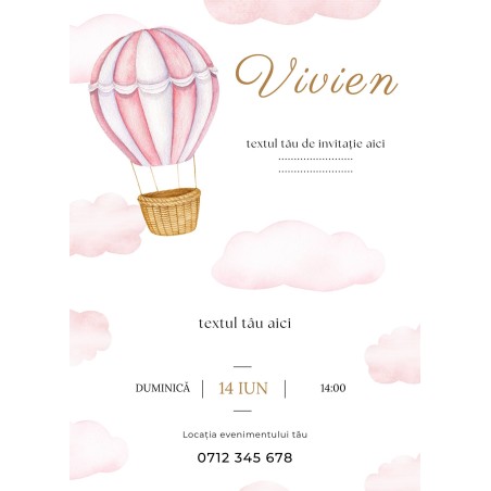 Invitație elegantă pentru botez, adresată fetițelor, decorată cu motive de baloane și nori roz. Dimensiune: 10x15 cm, grosime material: 240 g/m2.