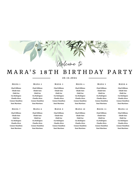 Listă de invitați elegantă pentru Majorat, cu fundal alb și elemente florale roz. Dimensiune: 30x42 cm. Grosime material: 230g/m2..