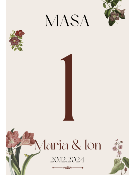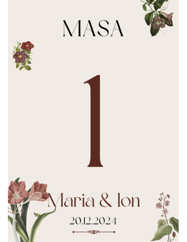 Numere de masă elegantă pentru Nuntă, în nuanțe de maro și bej, decorat cu modele florale. Dimensiuni: 10x15 cm. Grosime material: 240g/m2.